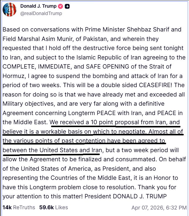 Donald Trump’s announcement of a two-week ceasefire referred to the existence of a 10-point plan for peace that Iran has offered. It is notable how positive Trump was about the plan, calling it a basis for negotiations. I have underlined the key sentences in his tweet about it.