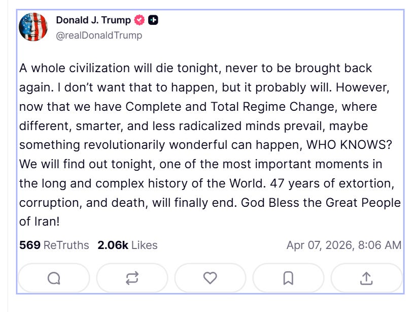 A “whole civilization will die tonight” seems to me that the US President is threatening genocide Now, thankfully, Trump did not follow through, but that actually makes what happens not less sobering. Trump made this claim, and much of the US political discussion normalized it. Some shrugged their shoulders and said: Its only Trump being Trump. Others said that it was not great, but….