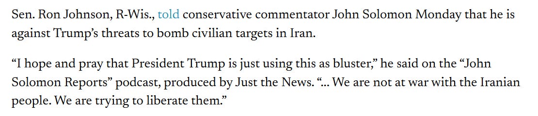 The losers in all this are the Iranian people, many of whom have fought for years and many of whom have lost their lives trying to end the Iranian governments harsh, theocratic rule. Trump, as I am sure you remember, has on numerous occasions justified his actions as a move to bring freedom to Iran. It was fascinating to see Senator Johnson trotting that line out even yesterday.