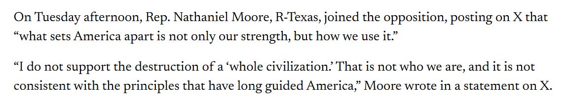 There were Republican criticisms of Trump’s threat, but they were surprisingly mild and interestingly did not rebuke the President personally. They were against the US committing genocide (hardly a strong position to take) but used deflection. Here are some: