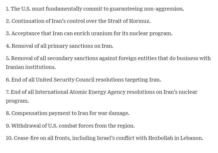 Here is the Iranian version of the 10-point plan, and it is worth breaking it down. This list was compiled by the Wall Street Journal.