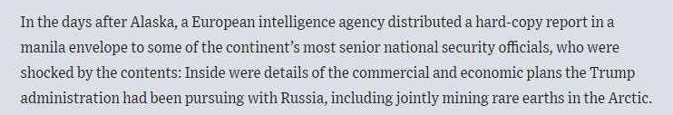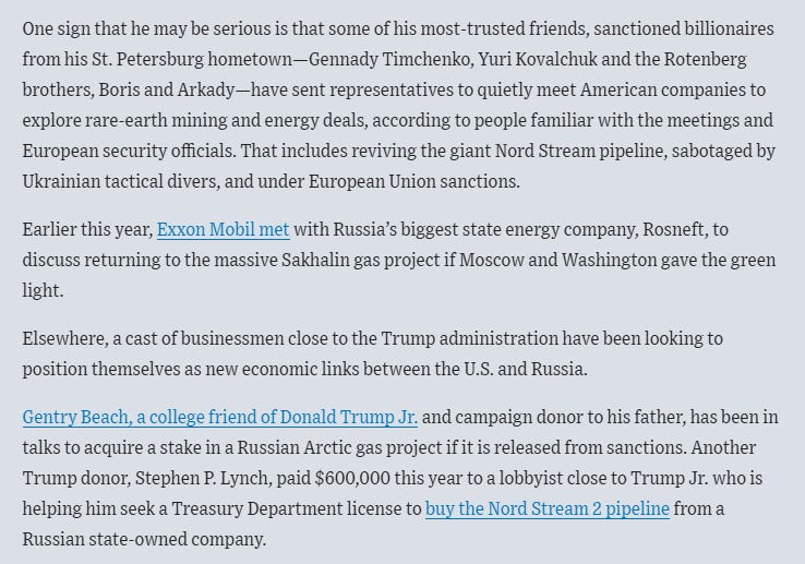 Before signing off, I wanted to put the focus on the dates during which US-Russian discussions heightened in the two big stories of the week. In the Wall Street Journal article, it was in August that large steps were taken to work out a business deal between the US and Russia. The Bloomberg story has Witkoff and Ulyanov coordinating actions in mid-October.