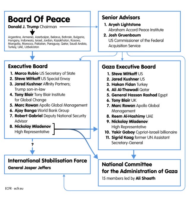Btw, the European Council for Foreign Relations has put together this useful schema of the Board of Peace’s structure, with the chairman in control.