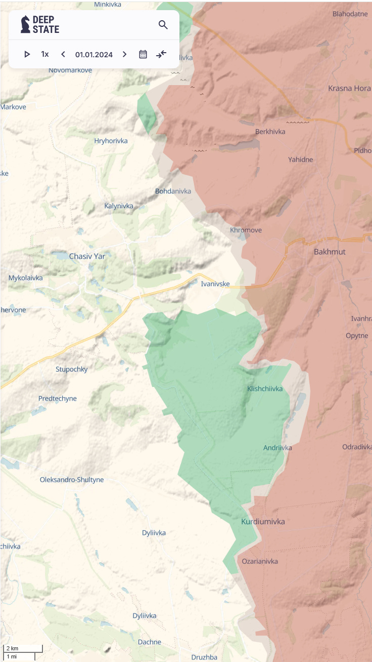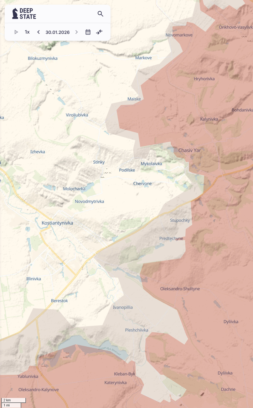I particularly like the continuing reference to Chasiv Yar at the top. This battle has been going on for two years. However focus has left it because Russian advances have basically stopped and instead reporters and analysts talk about Pokrovsk and Kupiansk as there has been slightly more movement in these places. However take a look at Chasiv Yar. After two years of attacks and untold losses, the Russians have still not taken the whole town. Just to reinforce that, here is a map of the front line around Chasiv Yar today (down to a 2-kilometer map gauge).