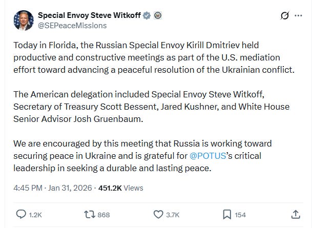 The two things to take from this is that the USA is continuing to provide cover to Putin as he kills Ukrainians. The Ukrainians understand that they are being played by the USA, they are not hopeful that the Trump administration will get them a fair deal, and “lots of good things” are not happening under the Trump administration’s oversight. However, by maintaining this fiction, the administration keeps any attempt to sanction Russia off the table and helps discourage Europeans from intervening more forcefully for Ukraine. The US government is simply lying at this point to protect Putin while he attacks Ukrainian civilian life. Btw, the fiction continues right now. Witkoff just met with Kirill Dmitriev in Florida and released this positive statement. According to Witkoff, Russia is “working hard” for a peace deal.